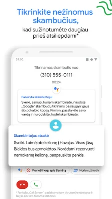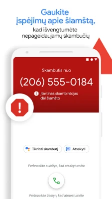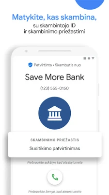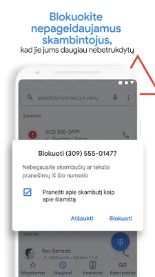 Atsibodo nuolatiniai nepageidaujami skambučiai, trukdantys Jūsų ramybei? „Telefono programa" siūlo išmanią apsaugą, leidžiančią atgauti kontrolę. Gaukite momentinius įspėjimus apie galimus sukčius, telemarketingo atstovus ar šlamšto siuntėjus ir veiksmingai juos blokuokite, užtikrindami, kad jie daugiau Jums nebetrukdytų. Su integruota ir išplėstine „Google" skambintojo ID sistema, visada žinosite, kas Jums skambina, net jei tai nepažįstamas verslo numeris, suteikdami ramybę atsiliepiant į bet kokį skambutį.